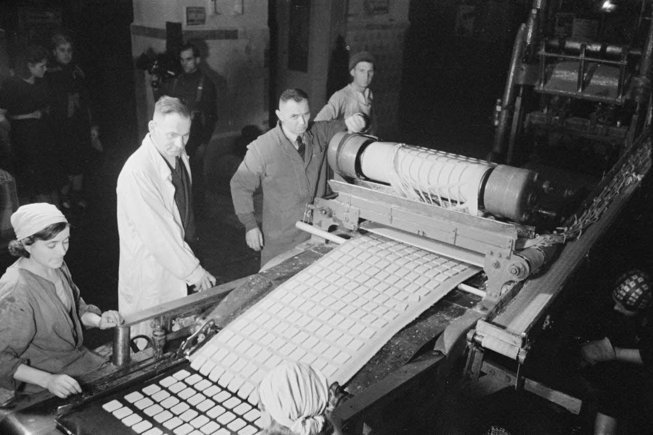 Des femmes russes travaillent dans une buiscuiterie sous le contrôle des contre-maitres allemands.