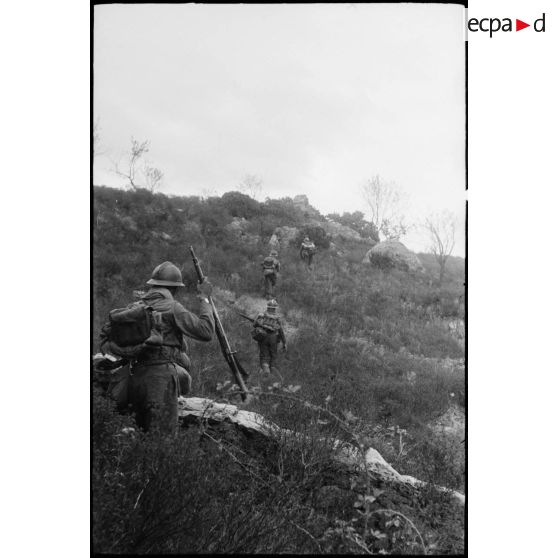 Des tirailleurs du 1er régiment de tirailleurs marocains (RTM) progressent vers le col de San Stefano.