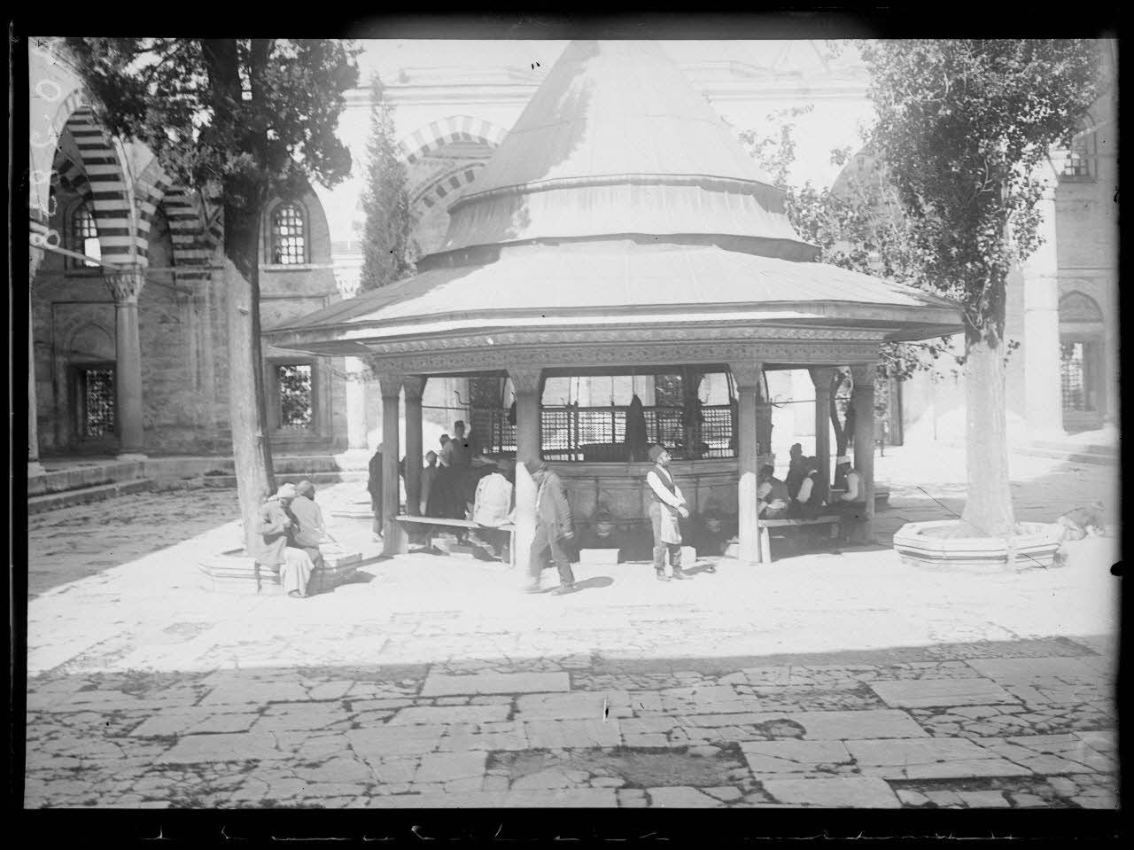 [Des hommes sont réunis autour d'une fontaine, dans l'enceinte de la mosquée de Beyazit, à Istanboul.]