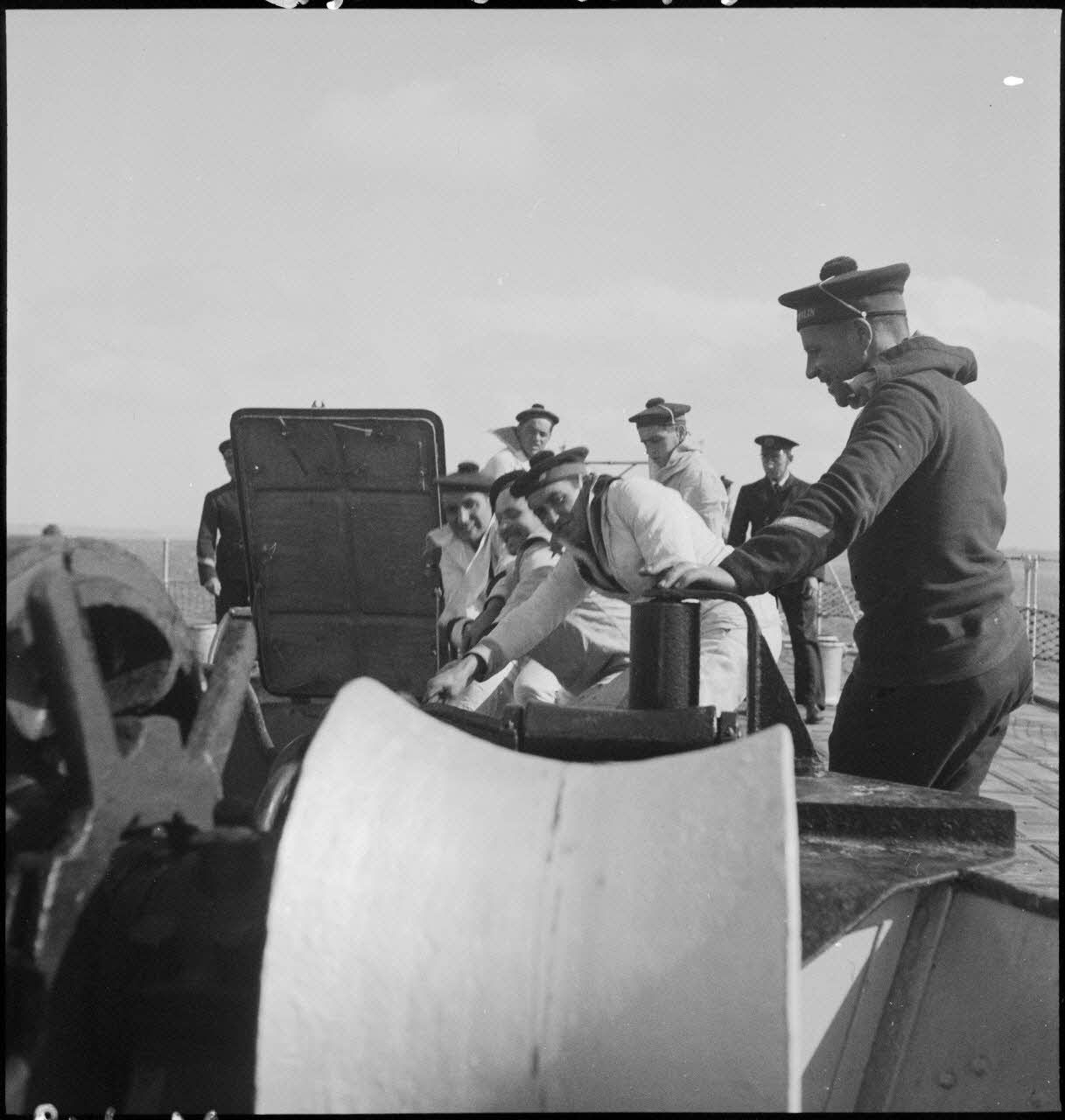Membres d'équipage à leur poste au blockhaus du contre-torpilleur Le Malin.