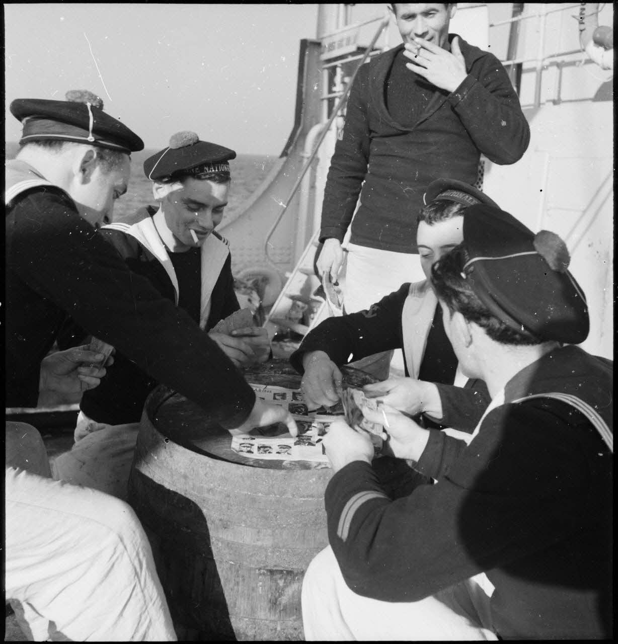 Des marins font une partie de cartes sur le pont du cargo réquisitionné Yang Tsé.