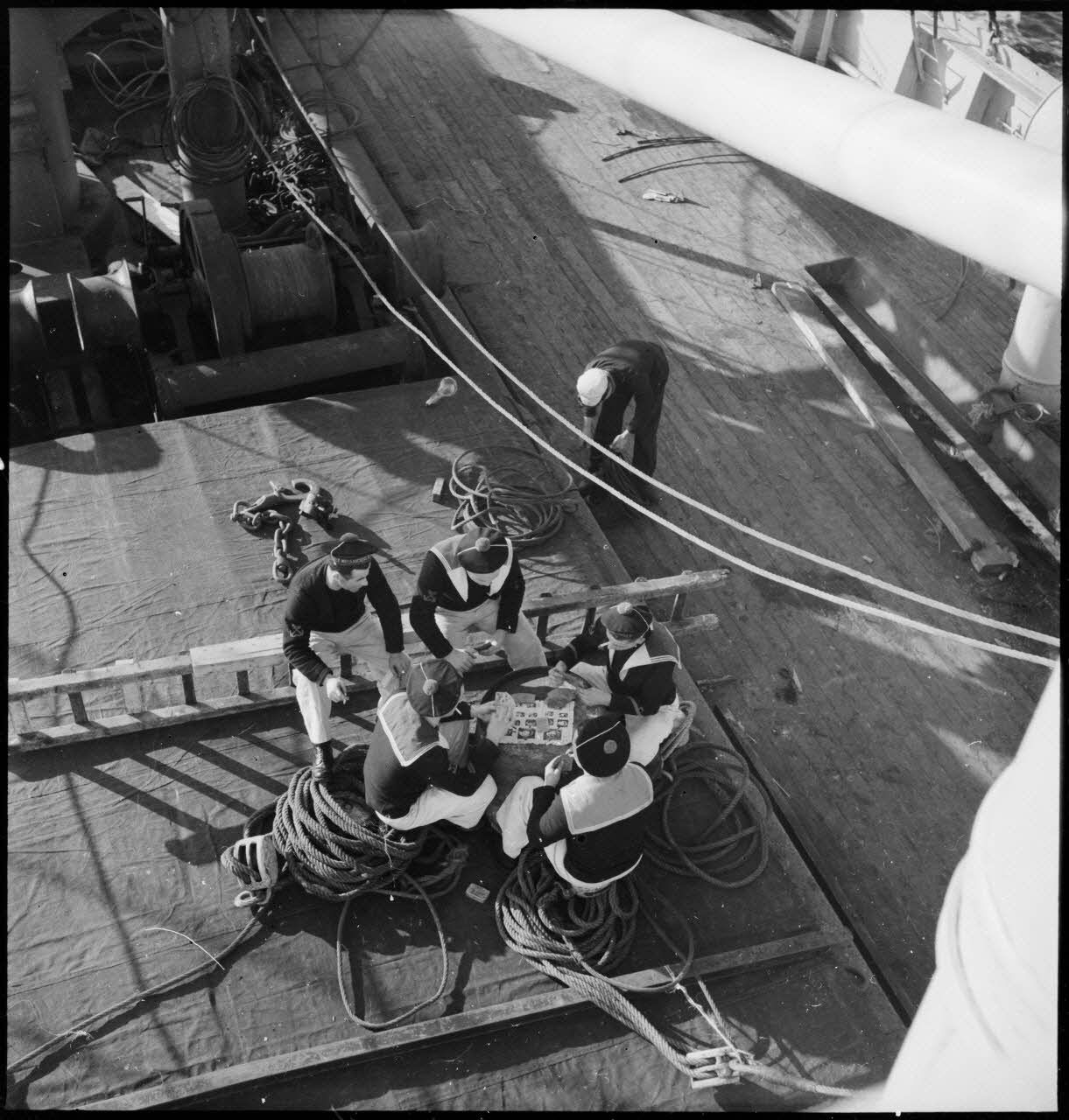 Des marins font une partie de cartes sur le pont du cargo réquisitionné Yang Tsé.