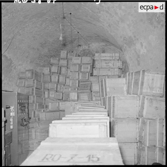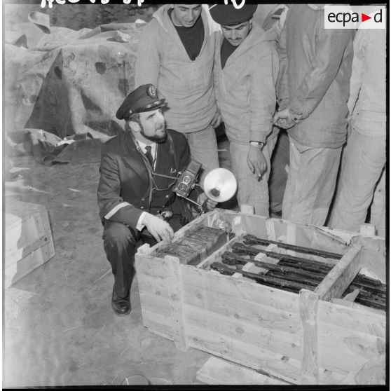 Le second maître (SM) René Bail devant une caisse d'ames, avec un appareil photo.