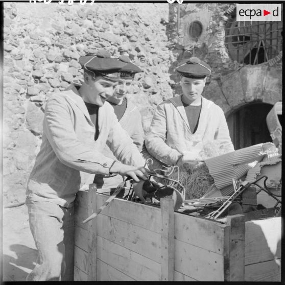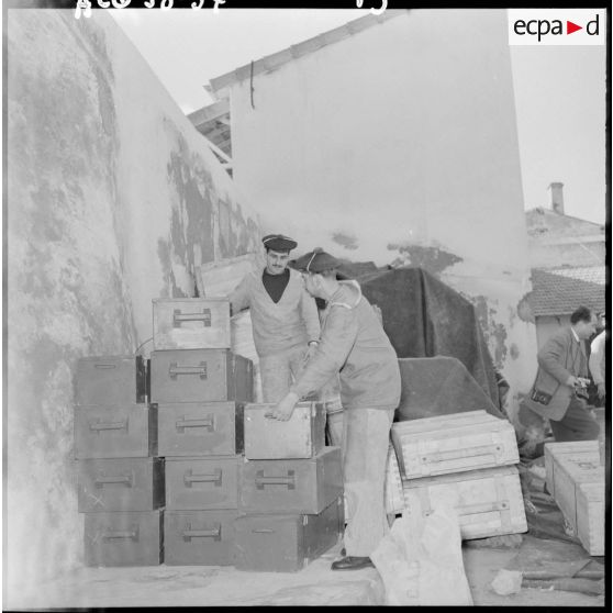 Des marins rangeant des caisses de matériel.