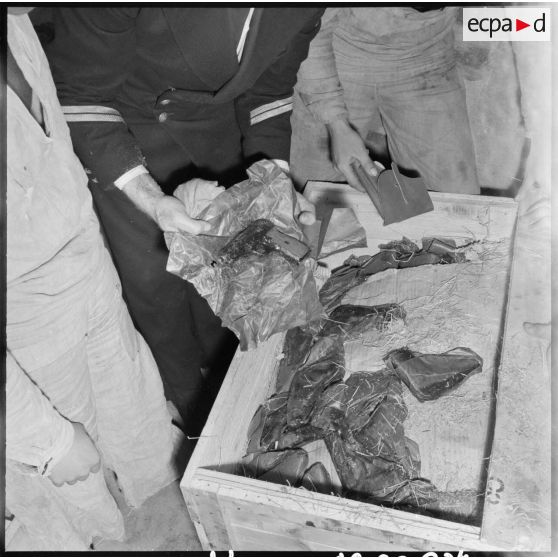 Des marins ouvrant une caisse en bois.