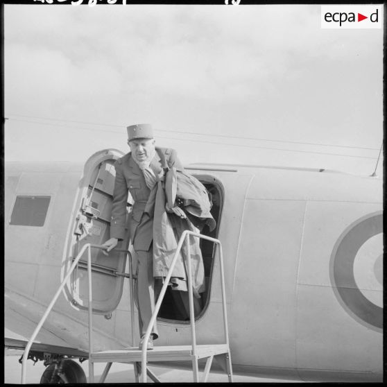 Le général Salan descendant d'un avion.