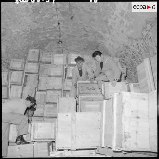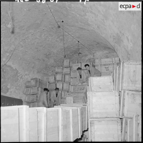 Des marins entassant des caisses dans un entrepôt.