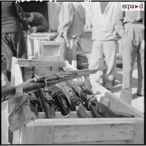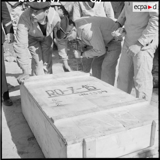 Des marins ouvrant des caisses d'armes.