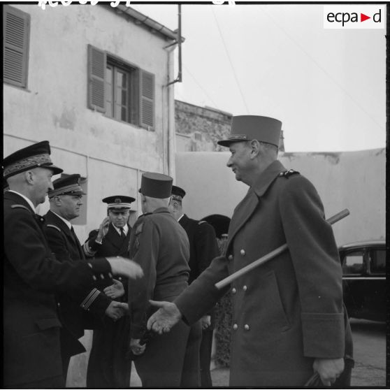 Le général Salan salue des officiers de la Marine.