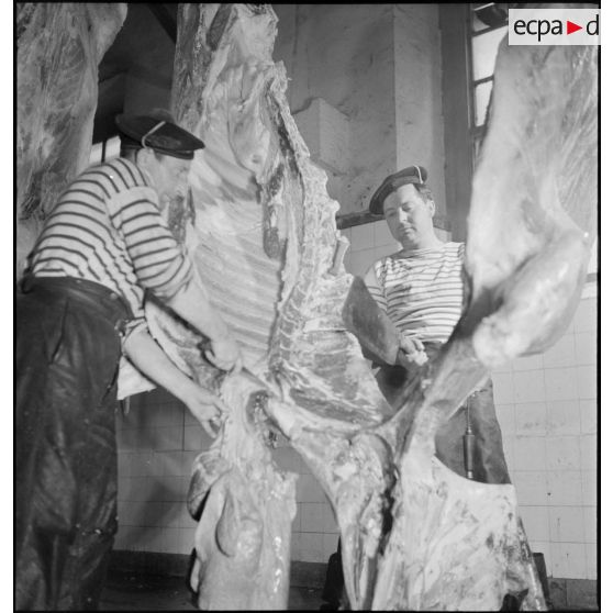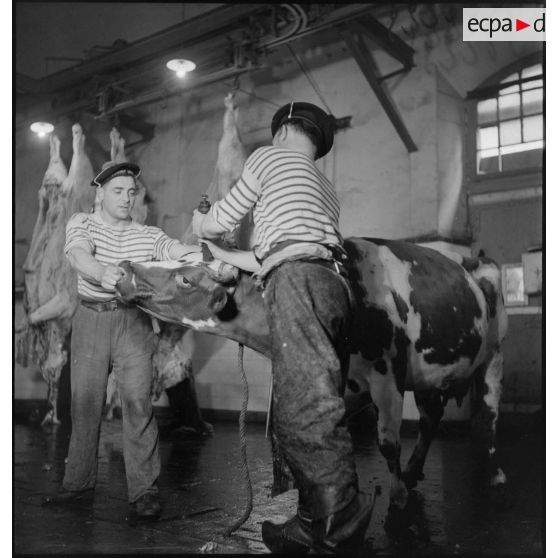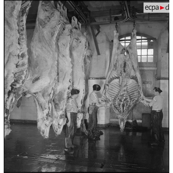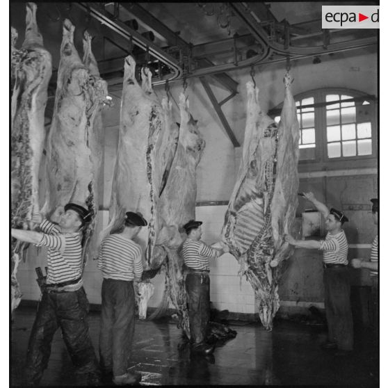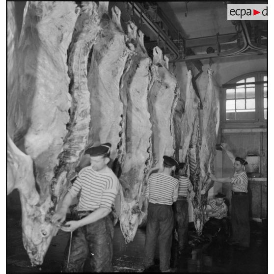 Reportage réalisé dans les abattoirs de la marine nationale sur la zone portuaire de Brest où est travaillée et conservée la viande destinée notamment au ravitaillement des troupes du CEFS (Corps expéditionnaire français en Scandinavie) en partance pour la campagne de Norvège.