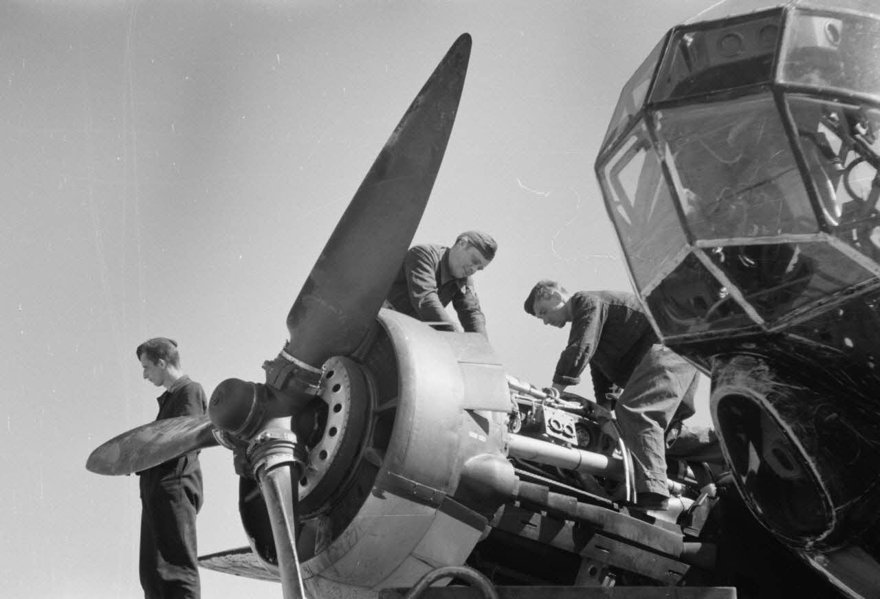 Des mécaniciens s'affairent sur l'un des moteurs BMW d'un bombardier Ju-88 du Kampfgeschwader 3 Blitz.