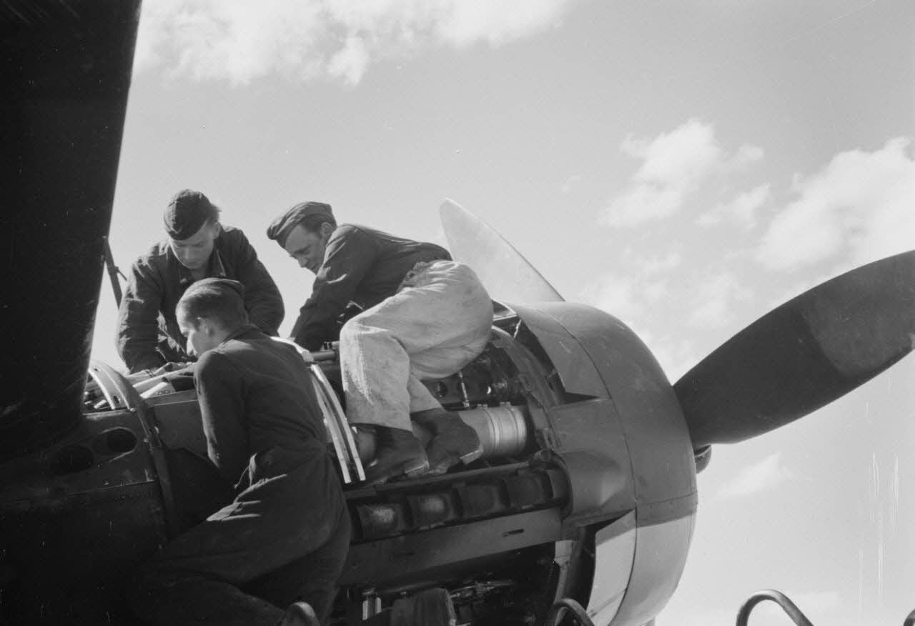 Des mécaniciens s'affairent sur l'un des moteurs BMW d'un bombardier Ju-88 du Kampfgeschwader 3 Blitz.