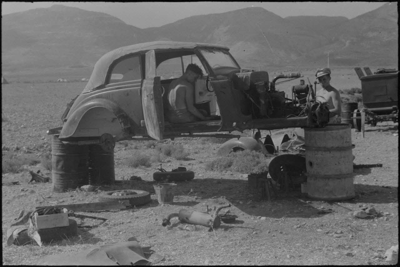 Des mécaniciens travaillent sur un véhicule cabriolet du service d'exploitation du terrain de Corfou qui porte les initiales FBK (Flughafenbetriebskompanie) sur sa porte.
