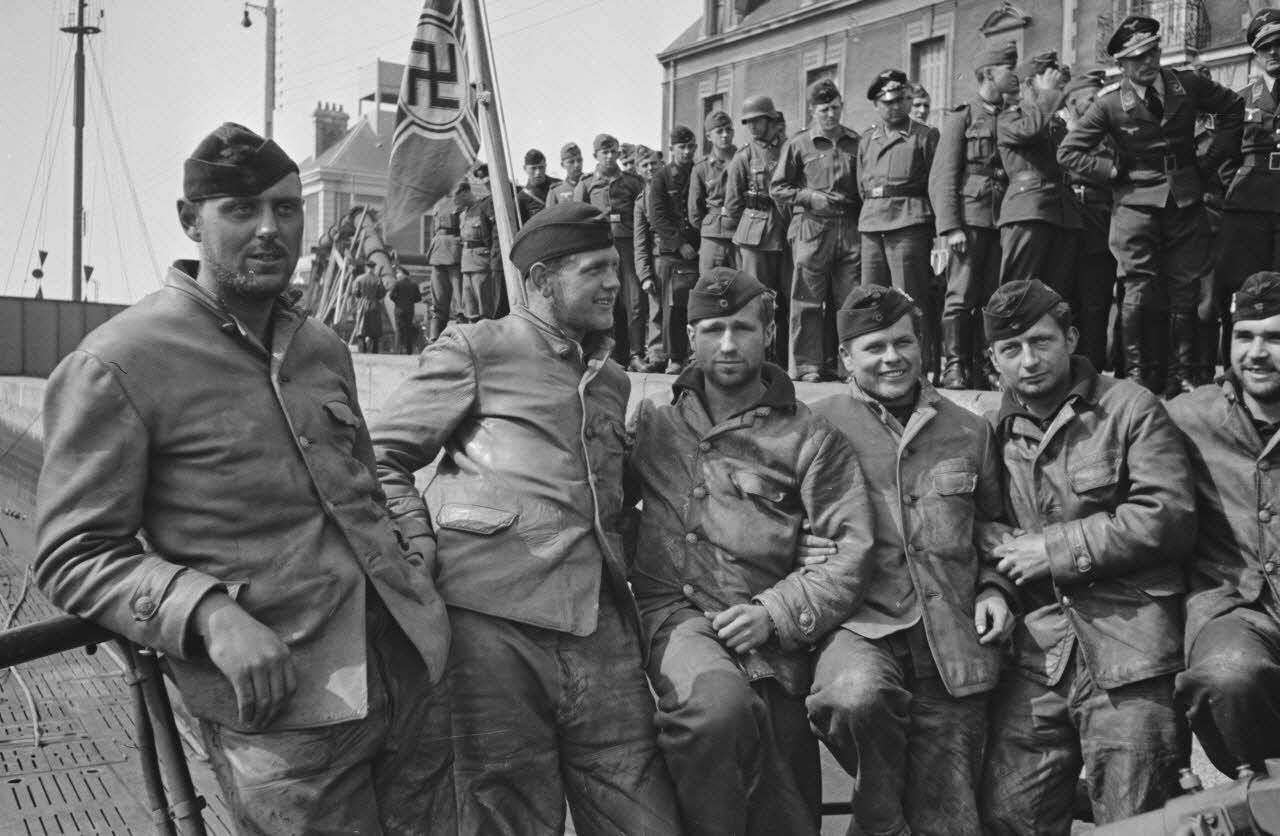 Des membres de l'équipage du sous-marin U-553 à leur retour de croisière dans le port de Saint-Nazaire.