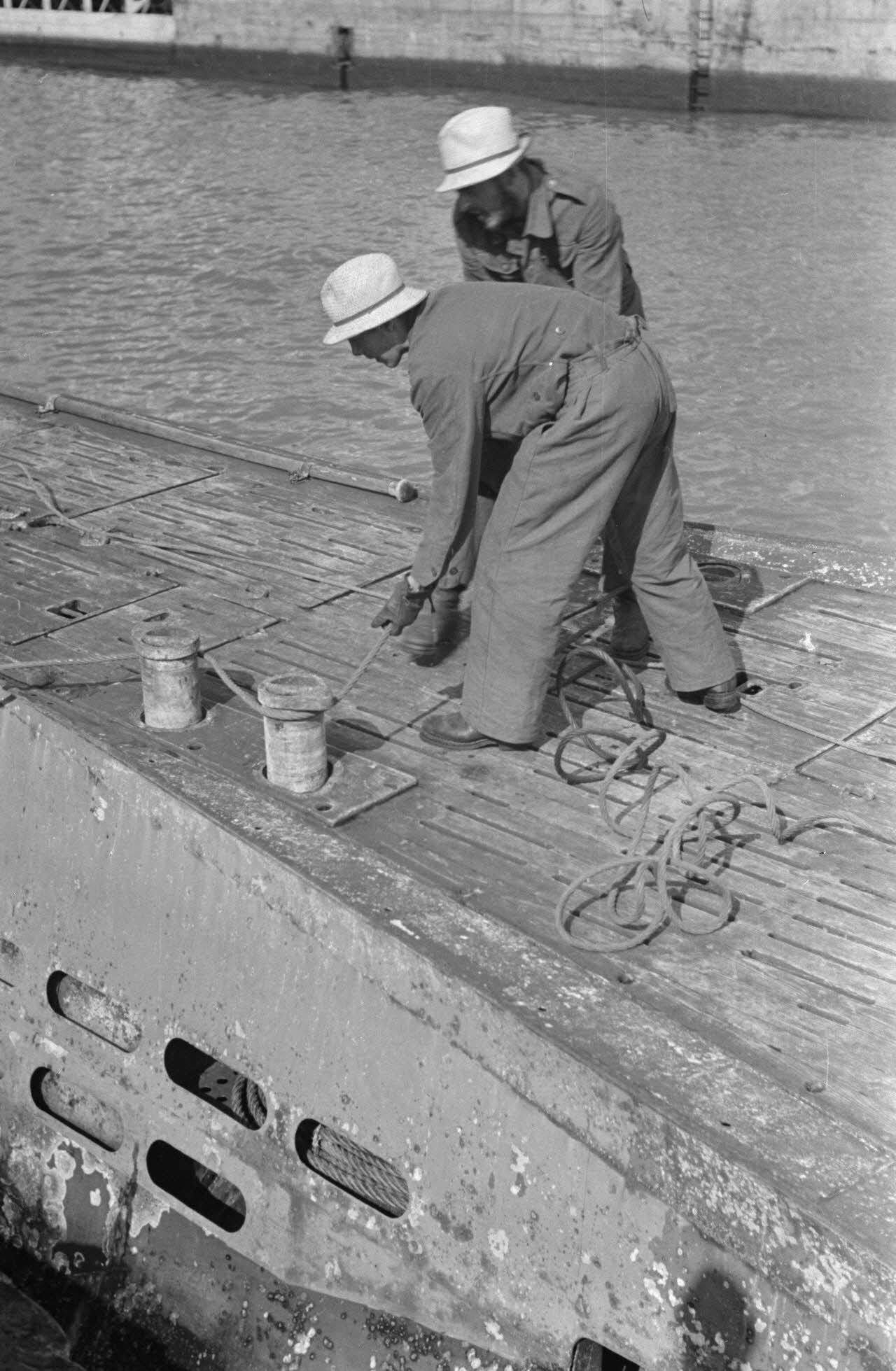 Des membres de l'équipage du sous-marin U-69 lors du retour du navire au port de Saint-Nazaire.