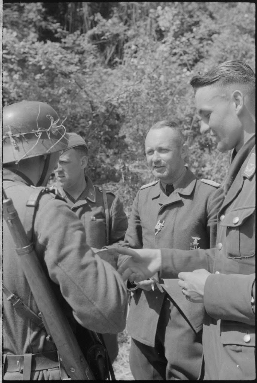 Un groupe d'officiers et de reporters de la 4e compagnie de propagande de l'armée de l'air allemande (Luftwaffe Kriegsberichter Kompanie 4) partagent du Champagne. On reconnaît notamment le capitaine Hans von Pebal fumant un cigarre. Un Sonderführer non identifié est également présent (DAA 556 L22 et L23).