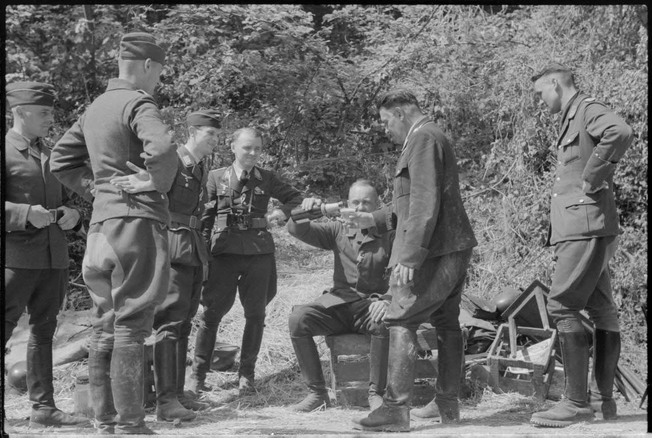 Un groupe d'officiers et de reporters de la 4e compagnie de propagande de l'armée de l'air allemande (Luftwaffe Kriegsberichter Kompanie 4) partagent du Champagne. On reconnaît notamment le capitaine Hans von Pebal fumant un cigarre. Un Sonderführer non identifié est également présent (DAA 556 L22 et L23).