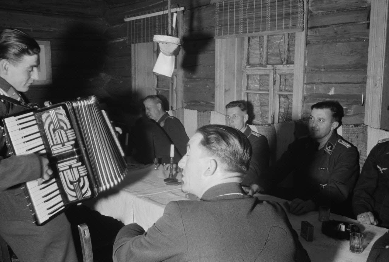 Des officiers de la Luftwaffe lors d'un repas, un sous-officier joue de l’accordéon.
