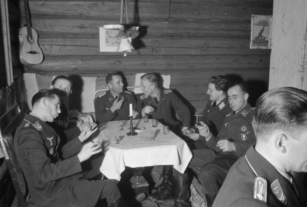 Des officiers de la Luftwaffe lors d'un repas, un sous-officier joue de l’accordéon.