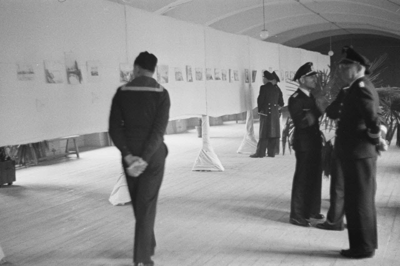 Des officiers de la marine allemande (Kriegsmarine) visitent une exposition de peintures (gouache et aquarelle).