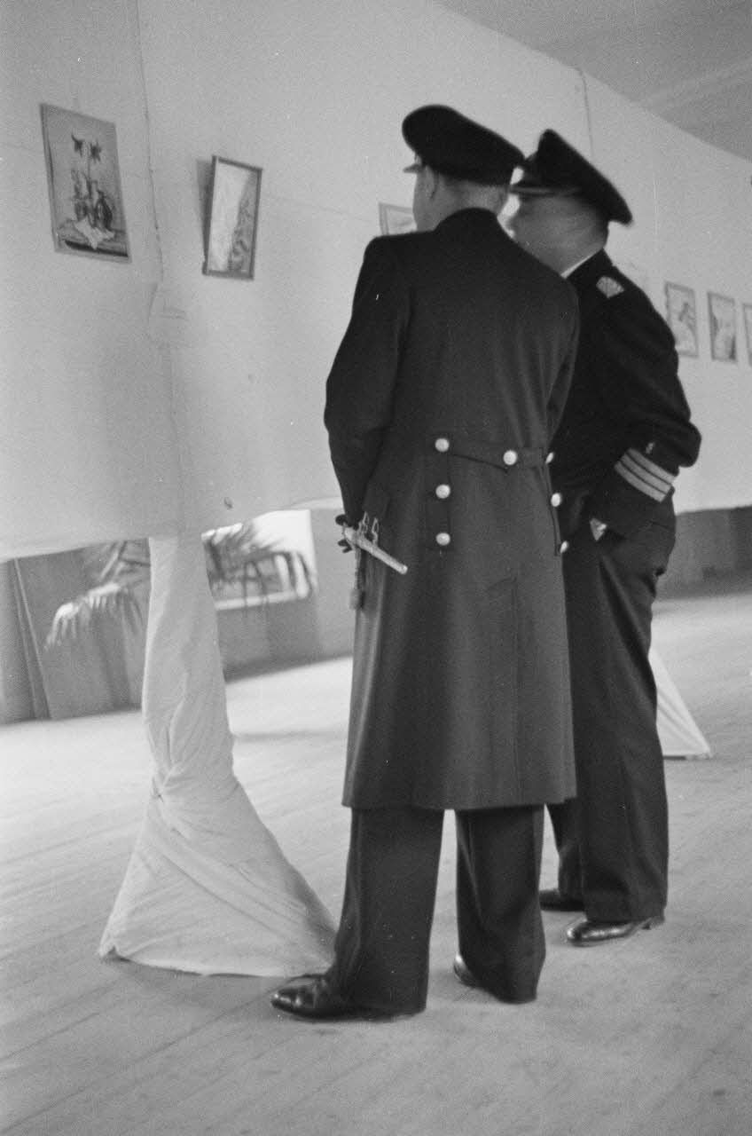 Des officiers de la marine allemande (Kriegsmarine) visitent une exposition de peintures (gouache et aquarelle).