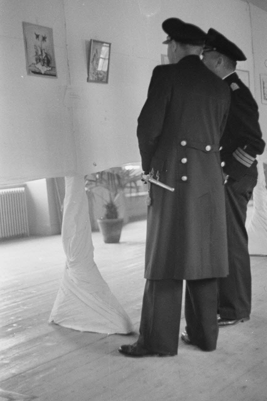Des officiers de la marine allemande (Kriegsmarine) visitent une exposition de peintures (gouache et aquarelle).
