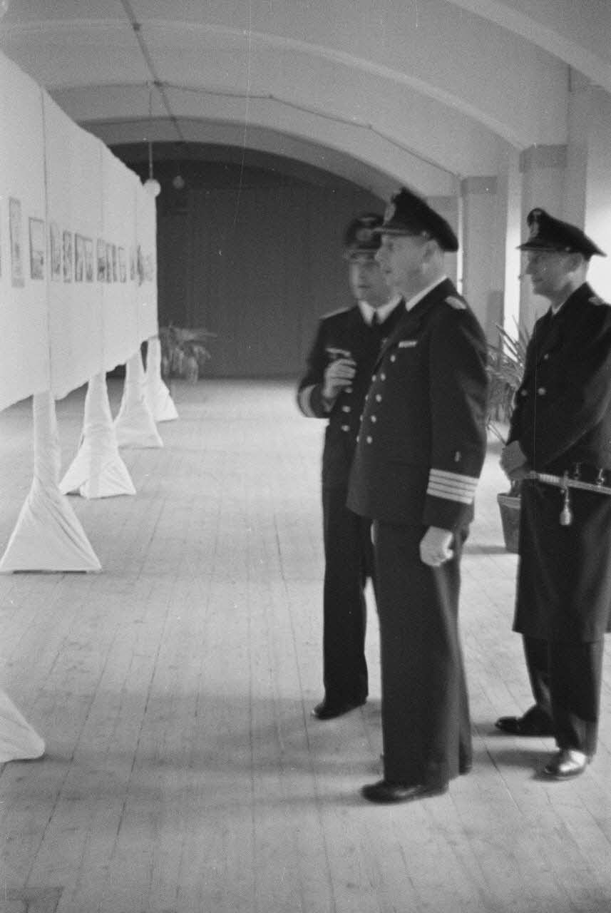 Des officiers de la marine allemande (Kriegsmarine) visitent une exposition de peintures (gouache et aquarelle).