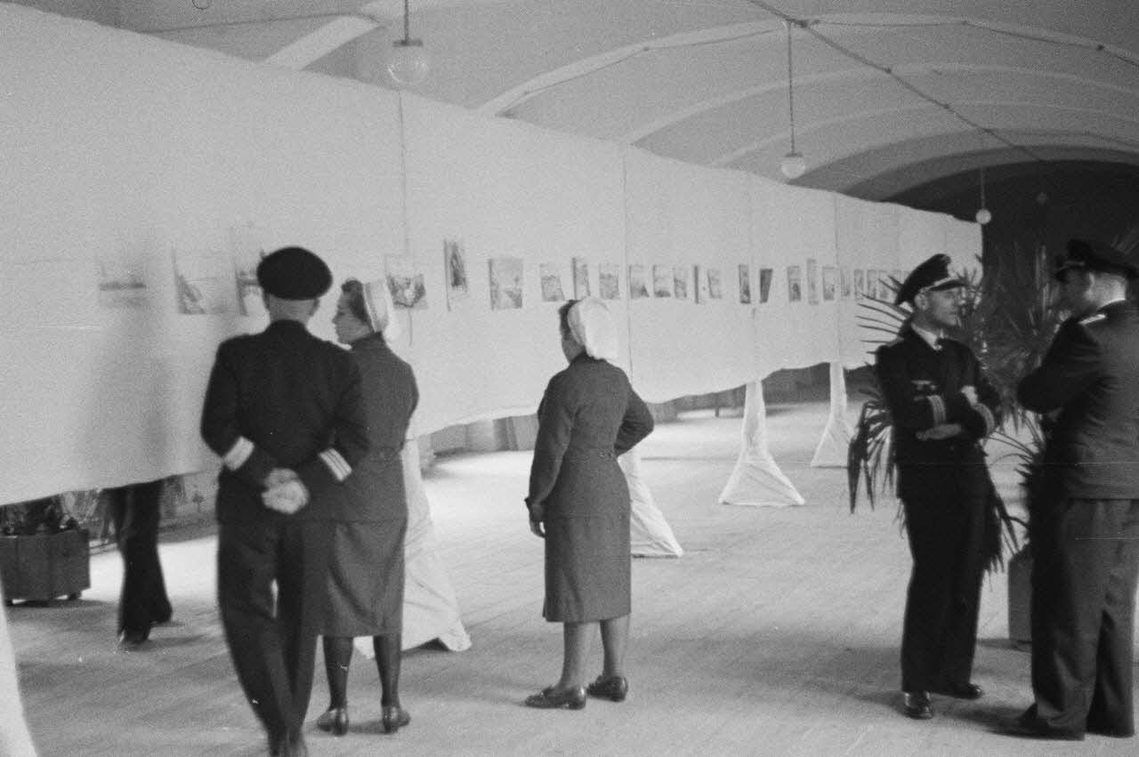 Des officiers de la marine allemande (Kriegsmarine) visitent une exposition de peintures (gouache et aquarelle).