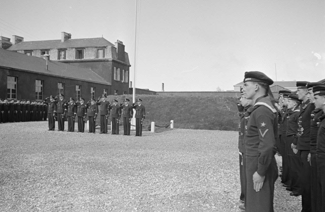 Lors d'une cérémonie de la Kriegsmarine à Saint-Nazaire, des sous-officiers au garde-à-vous devant le mat des couleurs.
