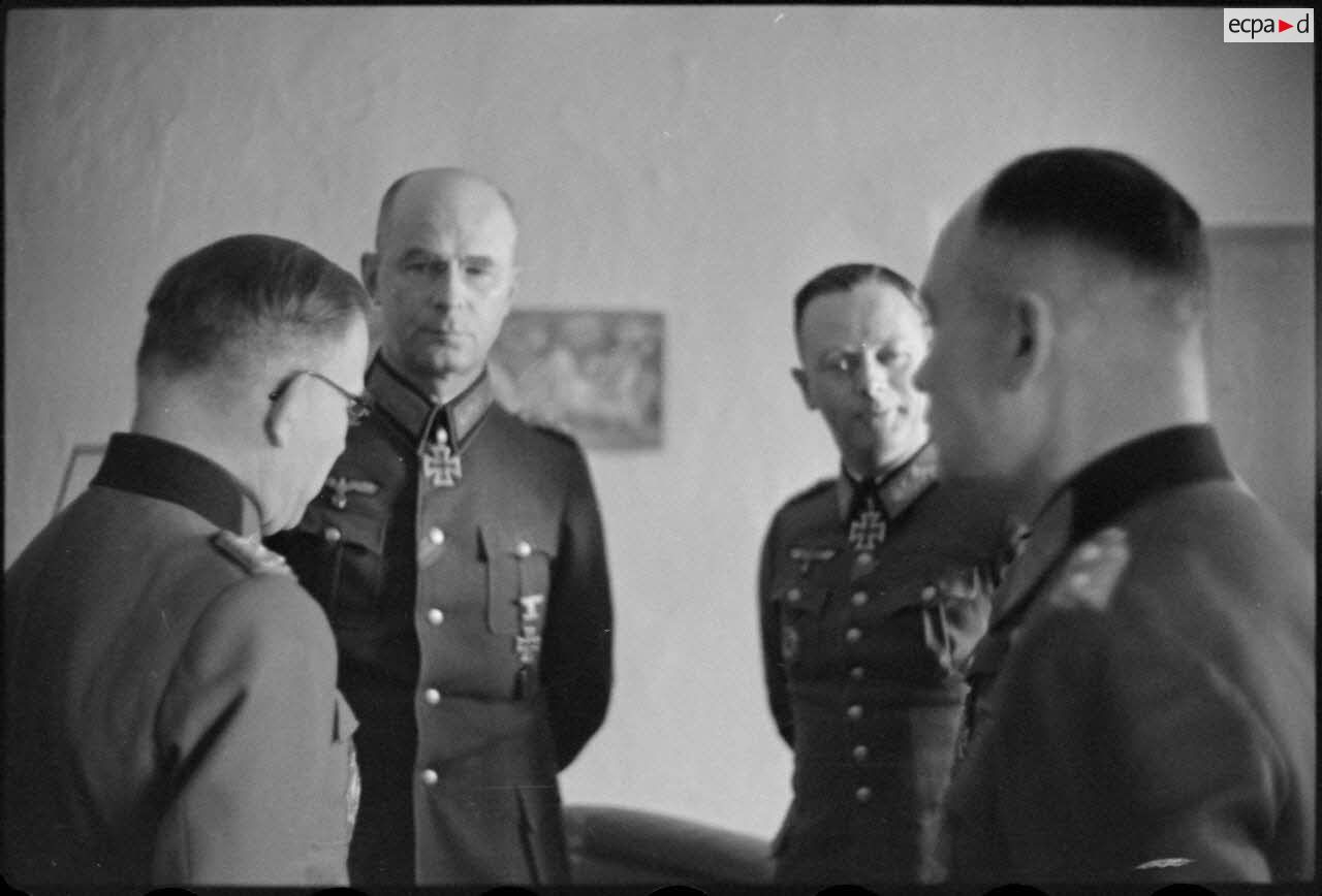 Une réunion d'état-major au sein de la 3e armée blindée (3.Panzerarmee) en présence du maréchal Ernst Busch, commandant du Groupe d'armée Centre.