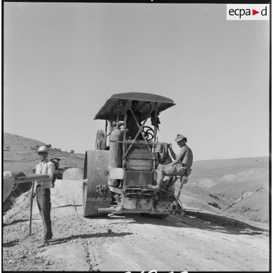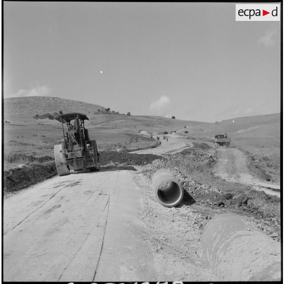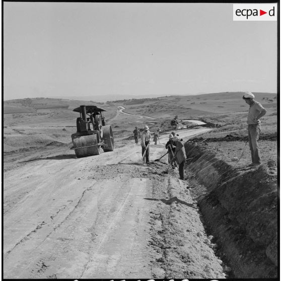 Des ouvriers algériens et des soldats du 9e BG posent des grillage sur le bas-côté de la piste en construction.