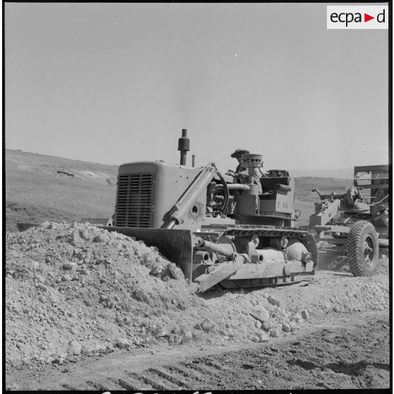 Sur la piste en construction, un bulldozer du 9e BG nivelle la route.