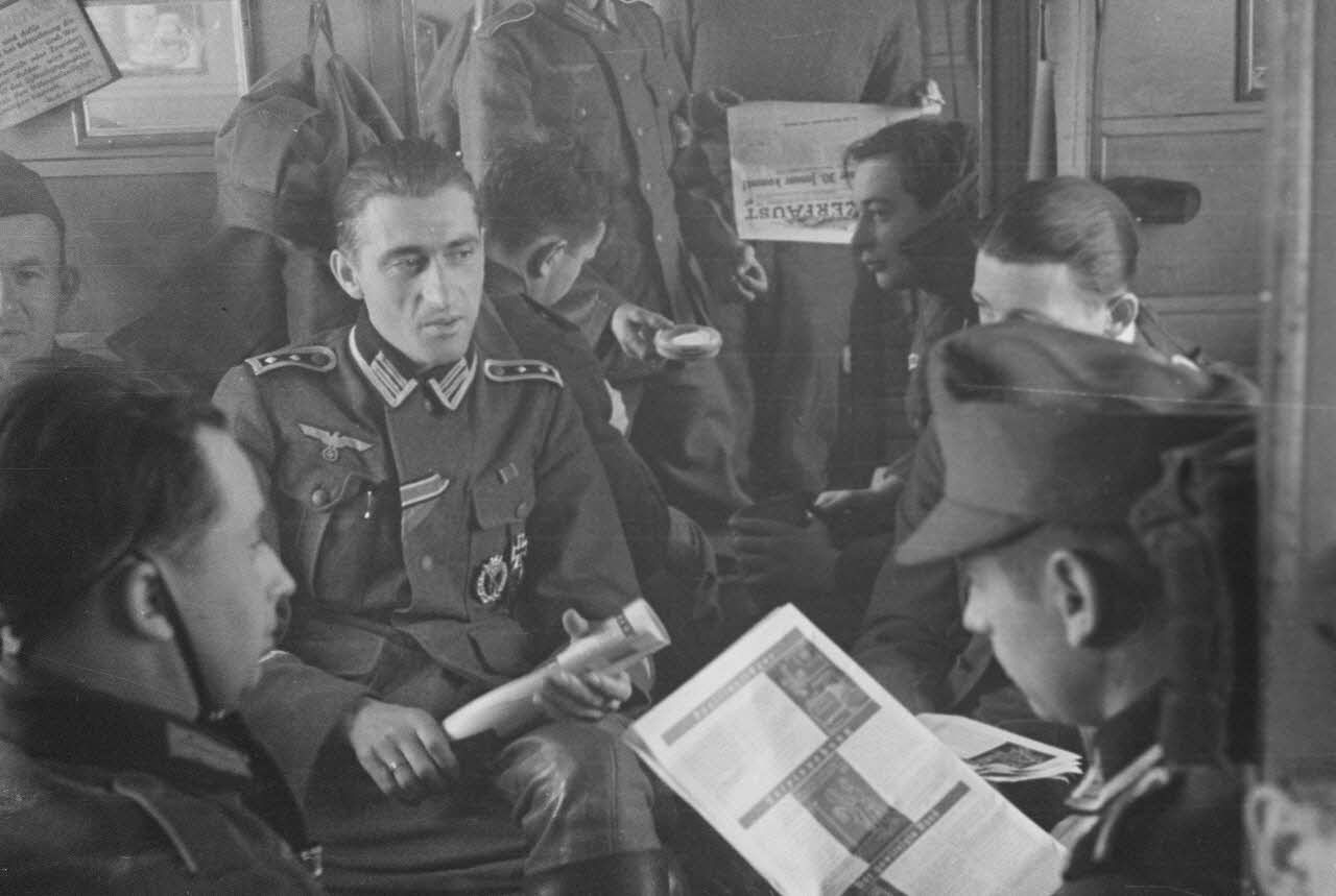 Des permissionnaires à bord d'un train, ici la lecture du journal de propagande Panzerfaust, édité par la Panzer-Propagandakompanie 697 (Pz-Pk.697).
