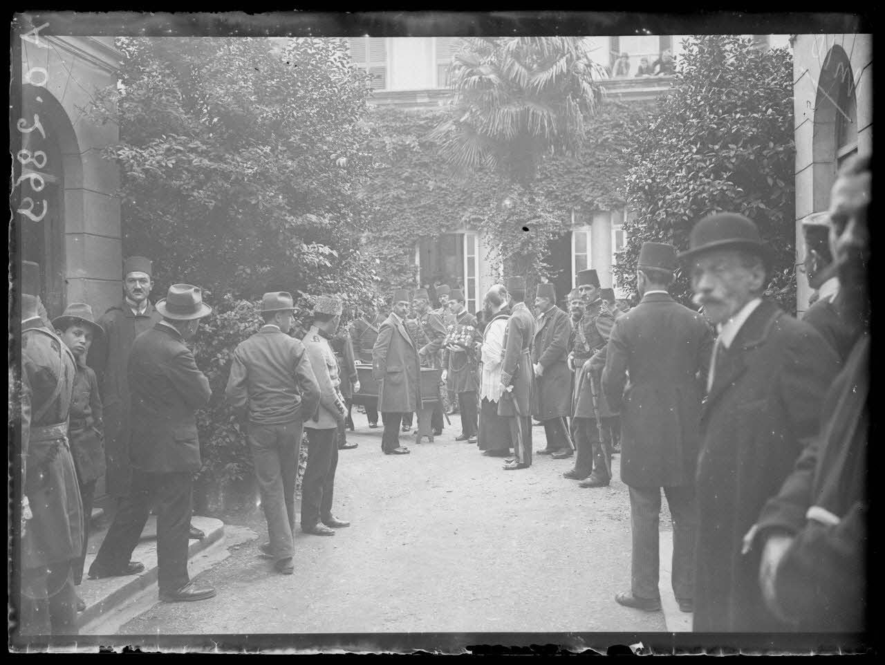[Des personnalités civiles et militaires sont rassemblées dans la cour d'une maison, autour d'un cercueil.]