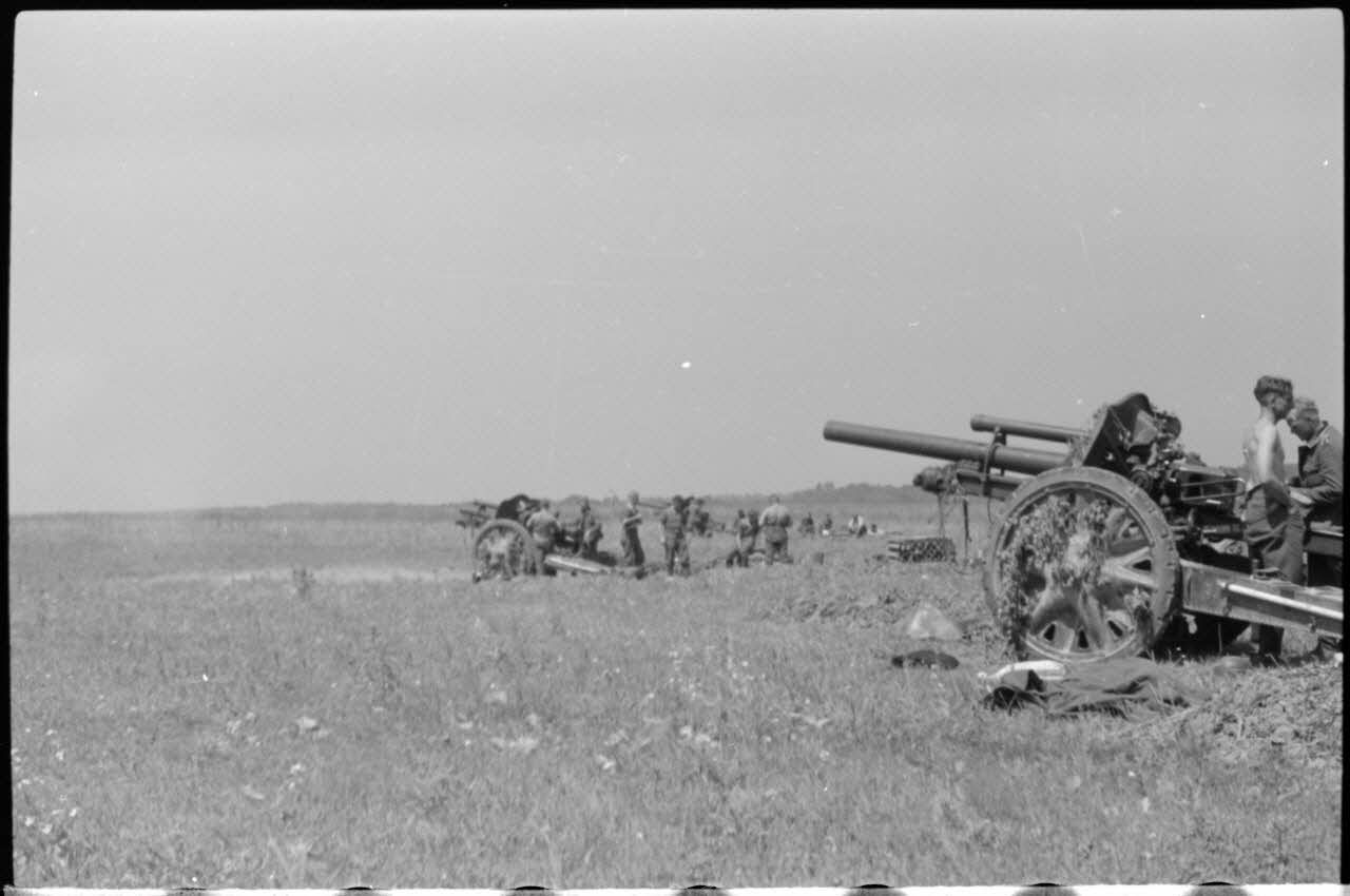 Des pièces d'artillerie 10, 5 cm FH 18 en action.