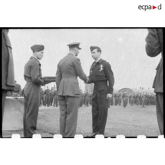 Un pilote du groupe de bombardement Lorraine sert la main à ....... avant de recevoir une décoration.