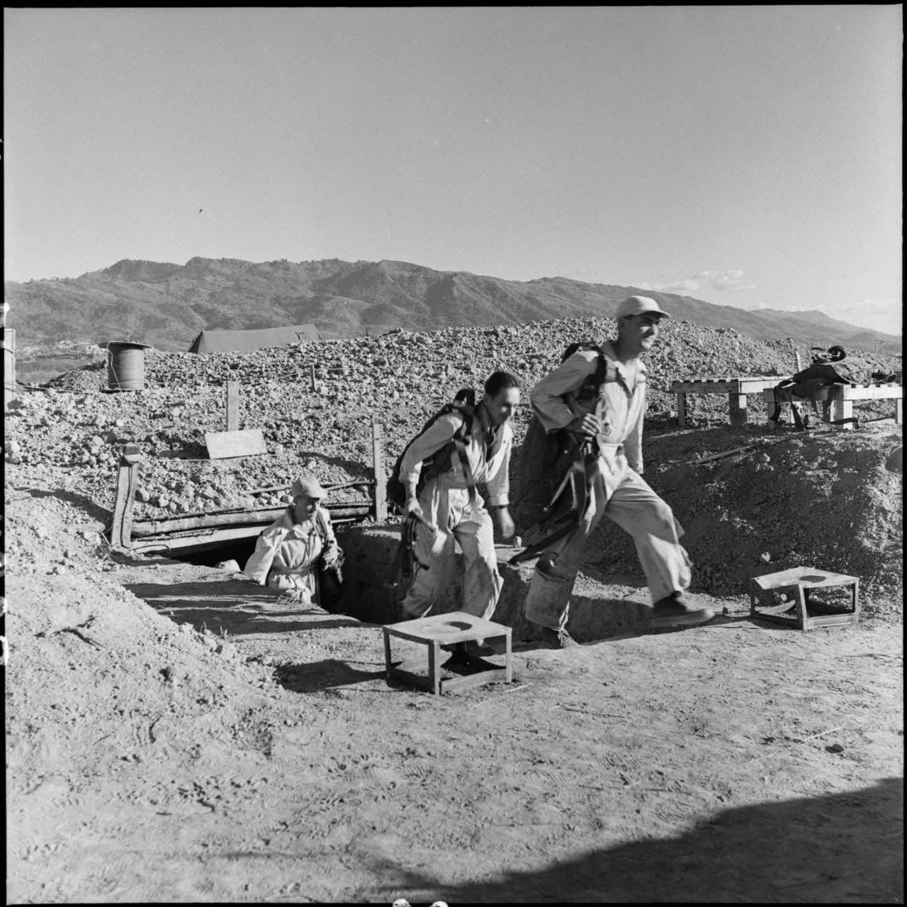 Des pilotes du groupe de chasse 1/22 Saintonge en tenue de vol sortent de leur abri pour gagner leurs appareils sur le terrain d'aviation de Diên Biên Phu.