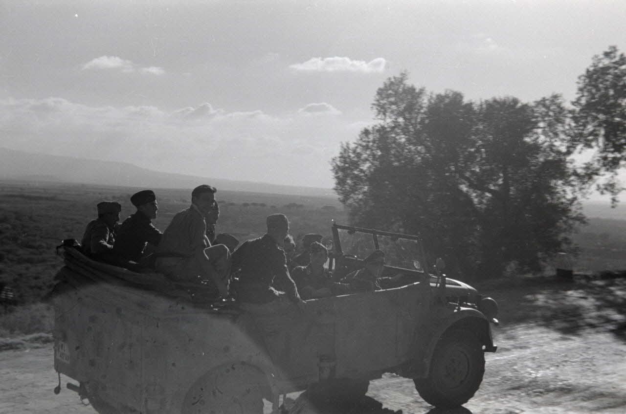 Des pilotes du Schlachtgeschwader 4 à bord d'une Horch Schwerer Einheits-Pkw (Typ 40) dépourvue de sa capote et immatriculée WL 402 140.