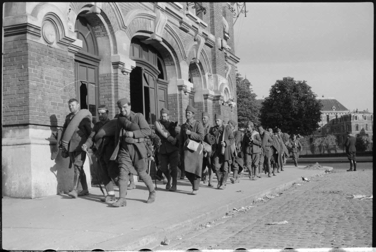 Des prisonniers alliés passent devant la gare du Cambrésis à Cambrai.