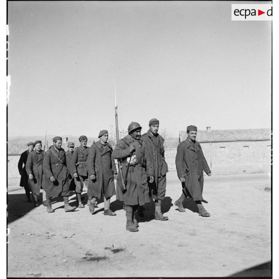 Des prisonniers italiens sont escortés vers un poste de commandement français pour y être interrogés.
