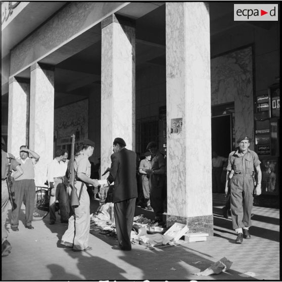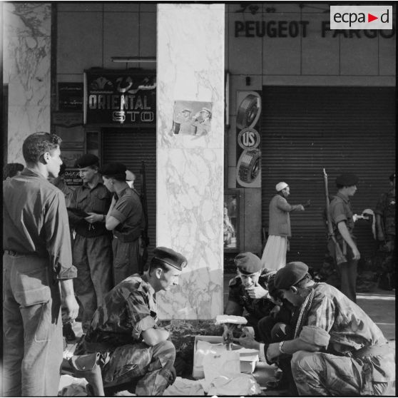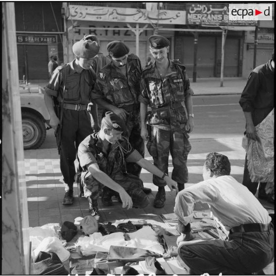 Parachutistes français devant un marchand à la sauvette à Port-Saïd.