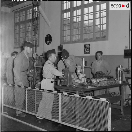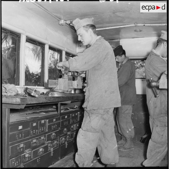 Des soldats de la 407ème compagnie de réparation divisionnaire (CRD) travaillent sur des machines dans l'atelier.