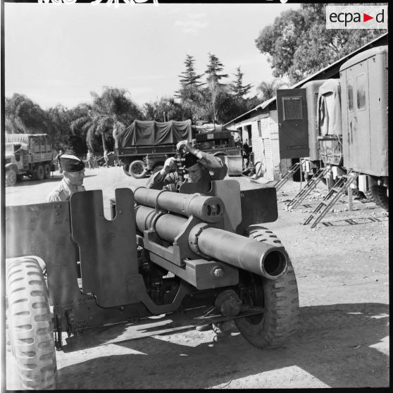Des soldats de la 407ème compagnie de réparation divisionnaire (CRD) vérifient une pièce d'artillerie 105 HM2 A1.<br>