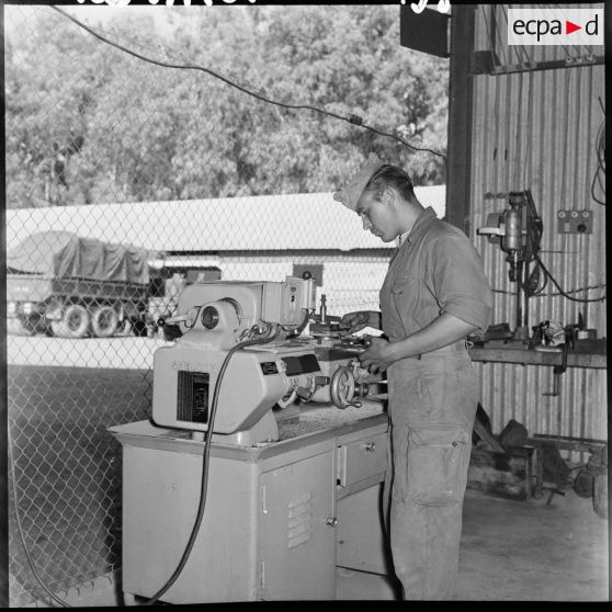 Un soldat de la 407ème compagnie de réparation divisionnaire (CRD) travaille sur une machine dans l'atelier.