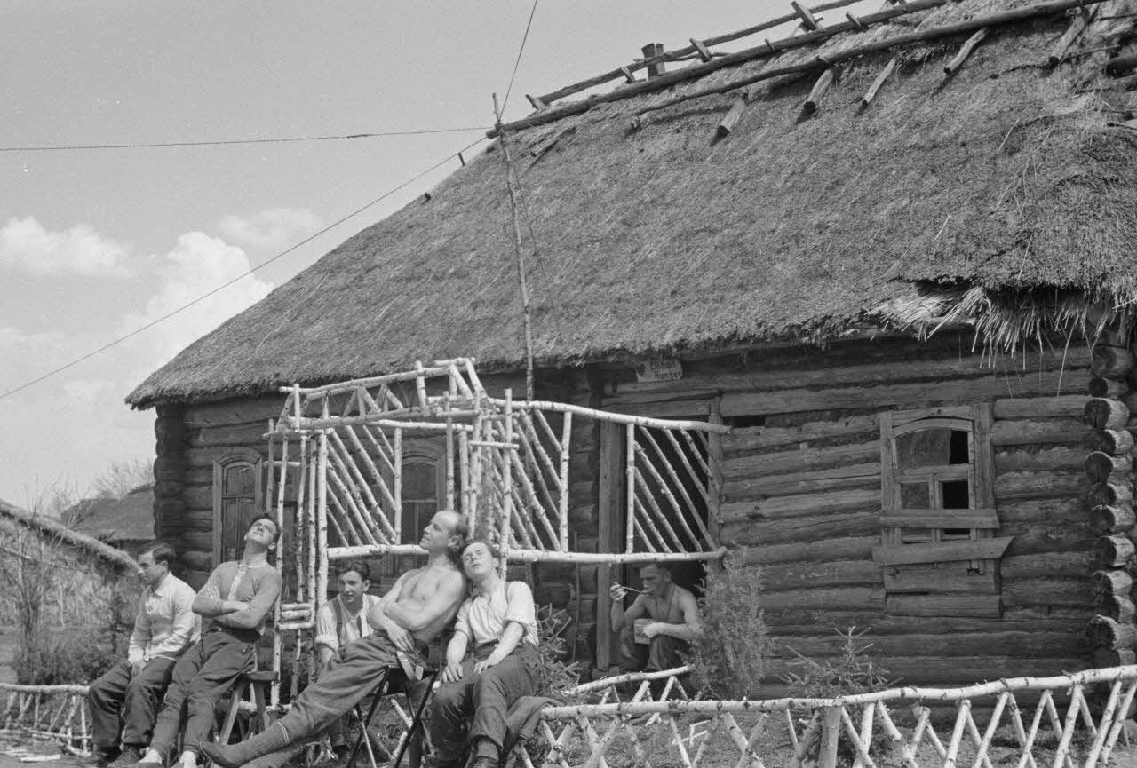 Des soldats de la Luftwaffe s'accordent une pause lors de la restauration d'une isba réquisitionnée.