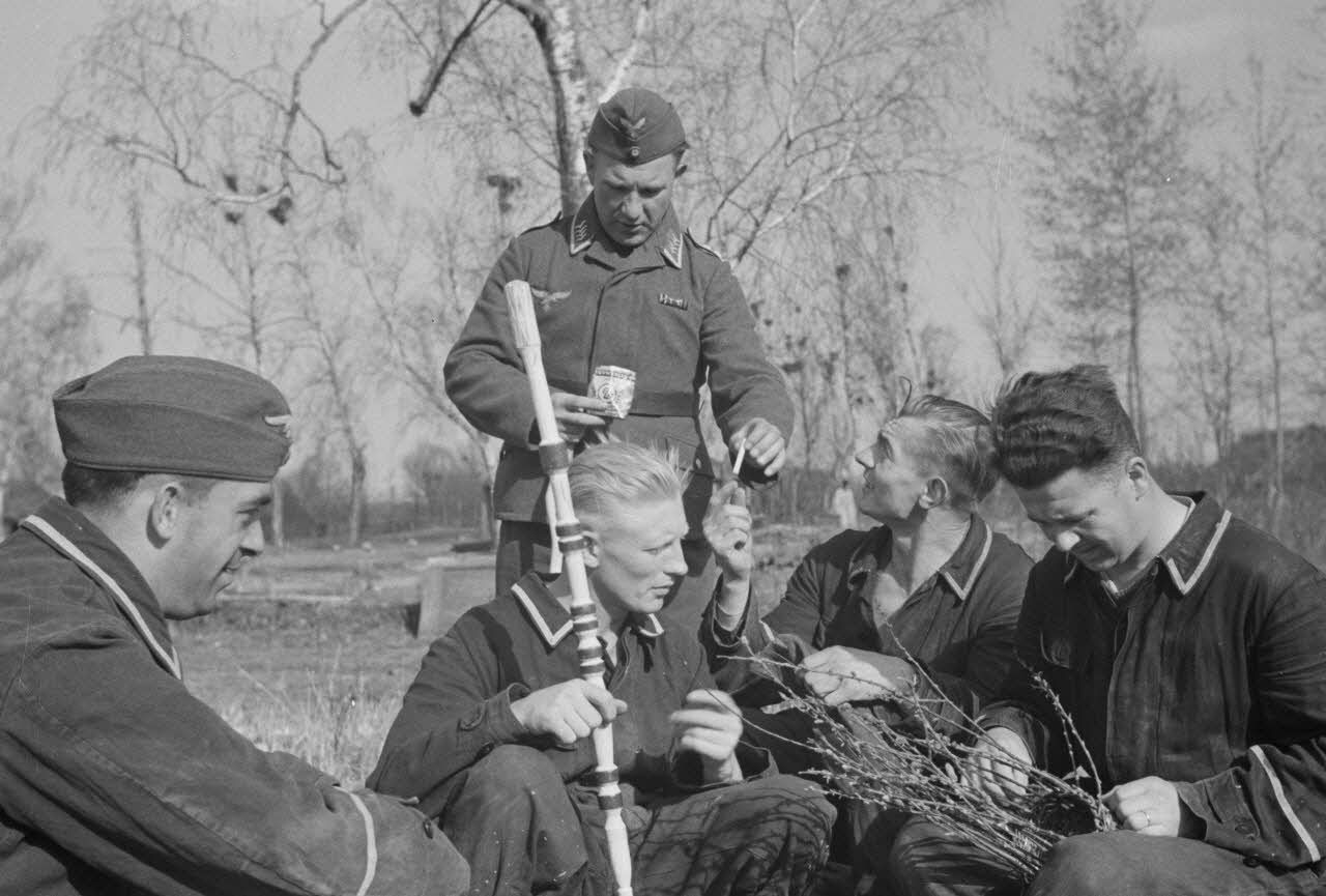 Des soldats de la Luftwaffe s'accordent une pause lors de la restauration d'une isba réquisitionnée.