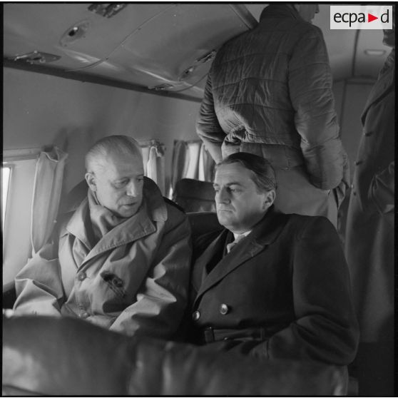 Discussion entre le secrétaire d'état aux forces armées Max Lejeune et le général Salan dans l'avion les amenant à l'aérodrome de Bône.