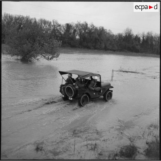 Des soldats patrouillent en jeep sur un chemin inondé près de Bône, le jour de la visite du secrétaire d'état Max Lejeune et du général Salan.