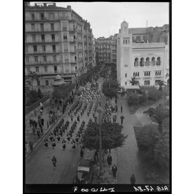 Convoi funéraire motorisé dans les rues d'Alger, accompagné d'unités de l'Armée d'Afrique montées et à pied.