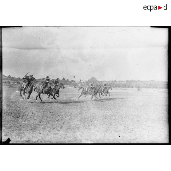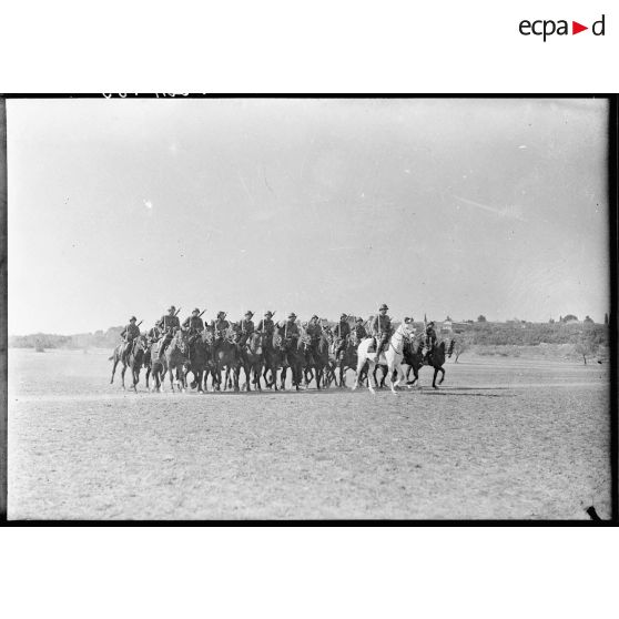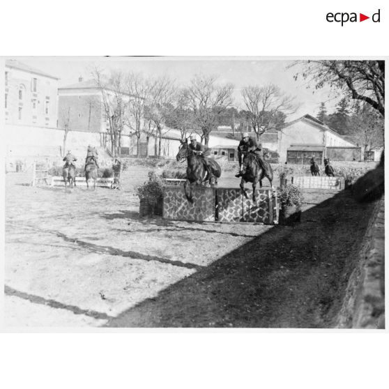 Des sous-officiers du 7e régiment de chasseurs à cheval (RCC) de Nîmes font du saut d'obstacles et un peloton est à l'exercice (ordre de bataille, charge, exercice de présenter de sabres).